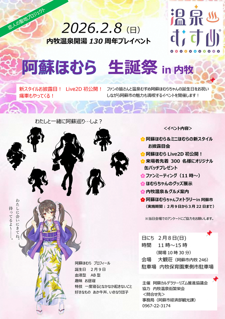 2月8日(日)に、内牧温泉「大観荘」にて温泉むすめ 「阿蘇ほむら」ちゃんの生誕祭 が開催されます!
