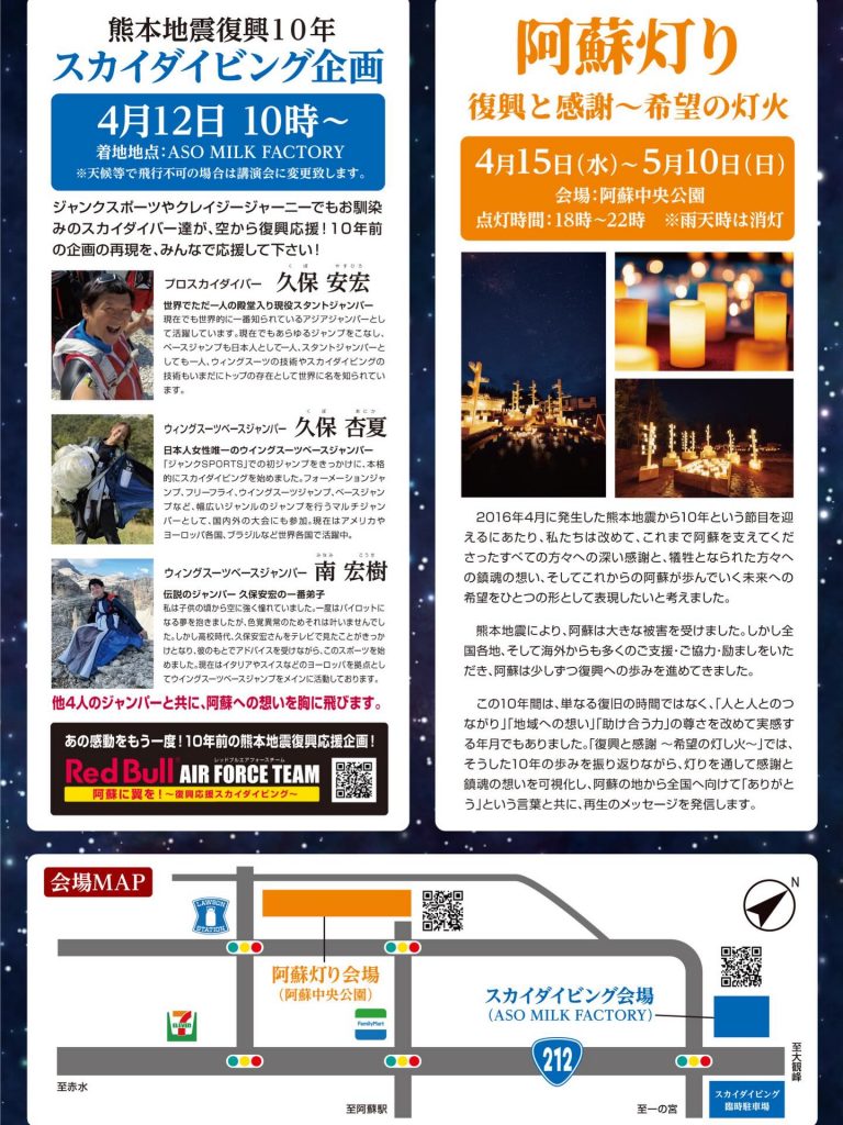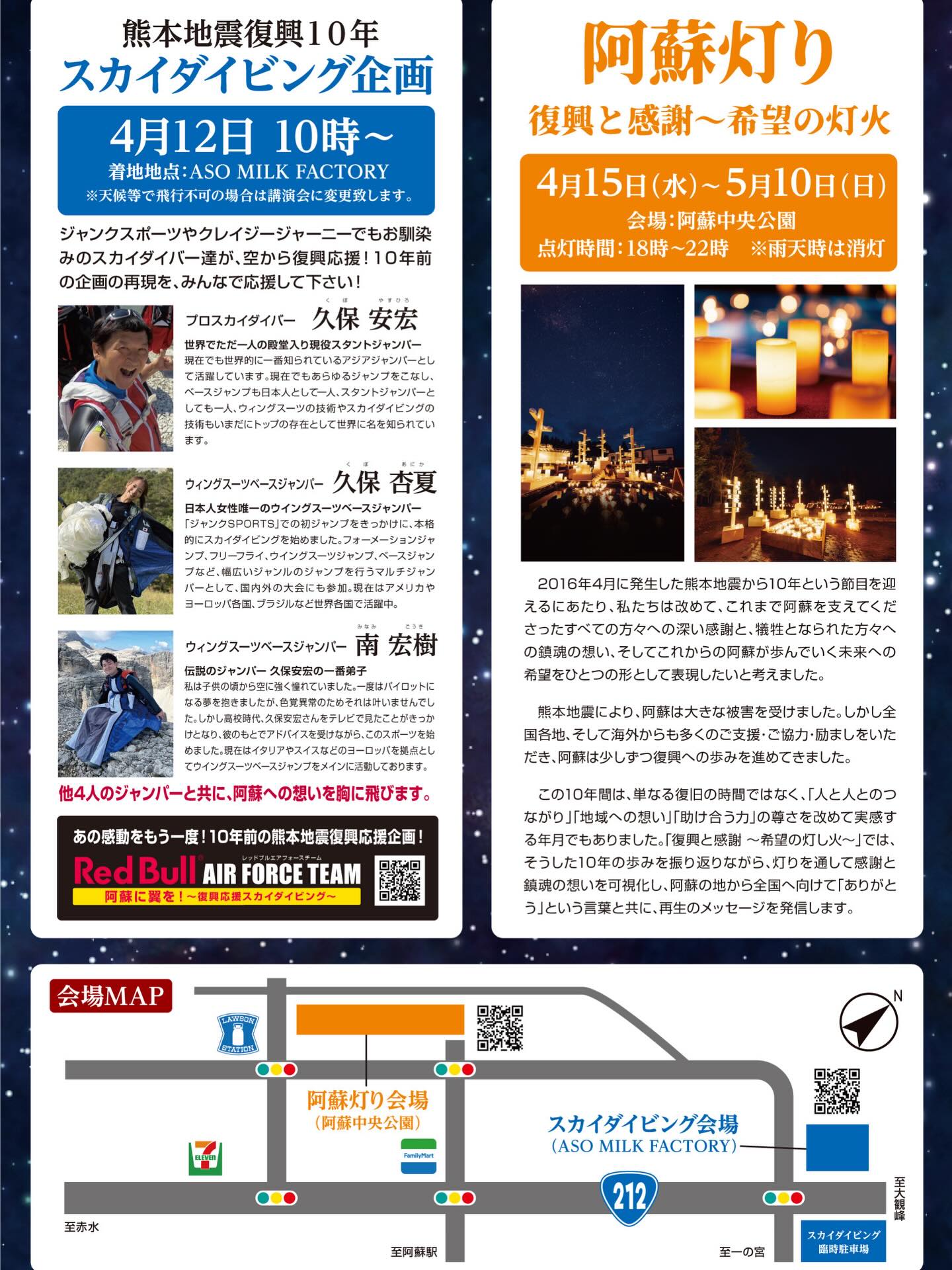 熊本地震から10年という節目を迎えるにあたり、テレビ番組「ジャンクSPORTS」や「クレイジージャーニー」でおなじみのスカイダイバーたちが阿蘇の空を舞うスカイダイビング企画や、10年の歩みを振り返りながら、灯りを通して感謝と鎮魂の想いを形にする「阿蘇灯り」が開催されます。